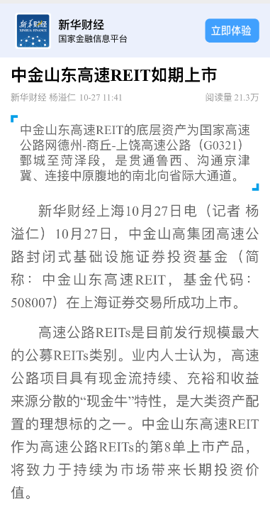 [新華社]中金山東高速REIT成功上市