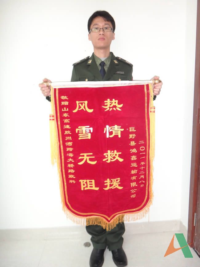 12月10日,魯RF7696斯太爾集裝箱車車主親自送來提有“風(fēng)雪無阻、熱情救援”的錦旗,以感謝山東高速膠州灣大橋工作人員的熱情幫助,樹立了山東高速良好的社會(huì)形象。