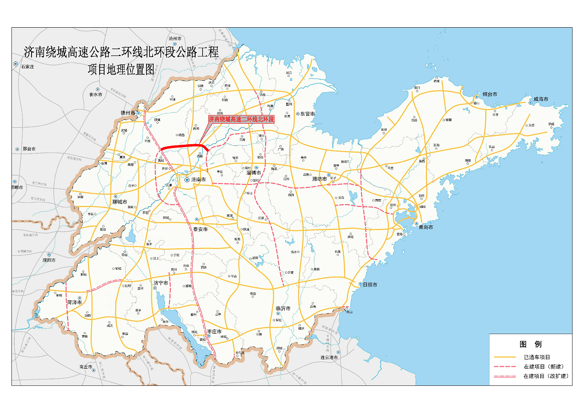 濟南大北環項目是我省高速公路網“九縱五橫一環七射多連”中“橫二支線”的重要組成部分。主線全長67.5公里,概算總投資141.7億元,采用雙向六車道高速公路標準建設,設計時速120公里,途經濟南章丘區、濟陽區和德州臨邑縣、禹城市等4個縣(市、區),設服務區2處,收費站5處。項目計劃建設一座長5837米的黃河特大橋,該橋主跨長度2×350米,采用獨塔自錨式懸索結構,建成后將成為全球最大跨徑的獨塔等跨自錨式懸索橋,也將為濟南再添一條跨黃通道。